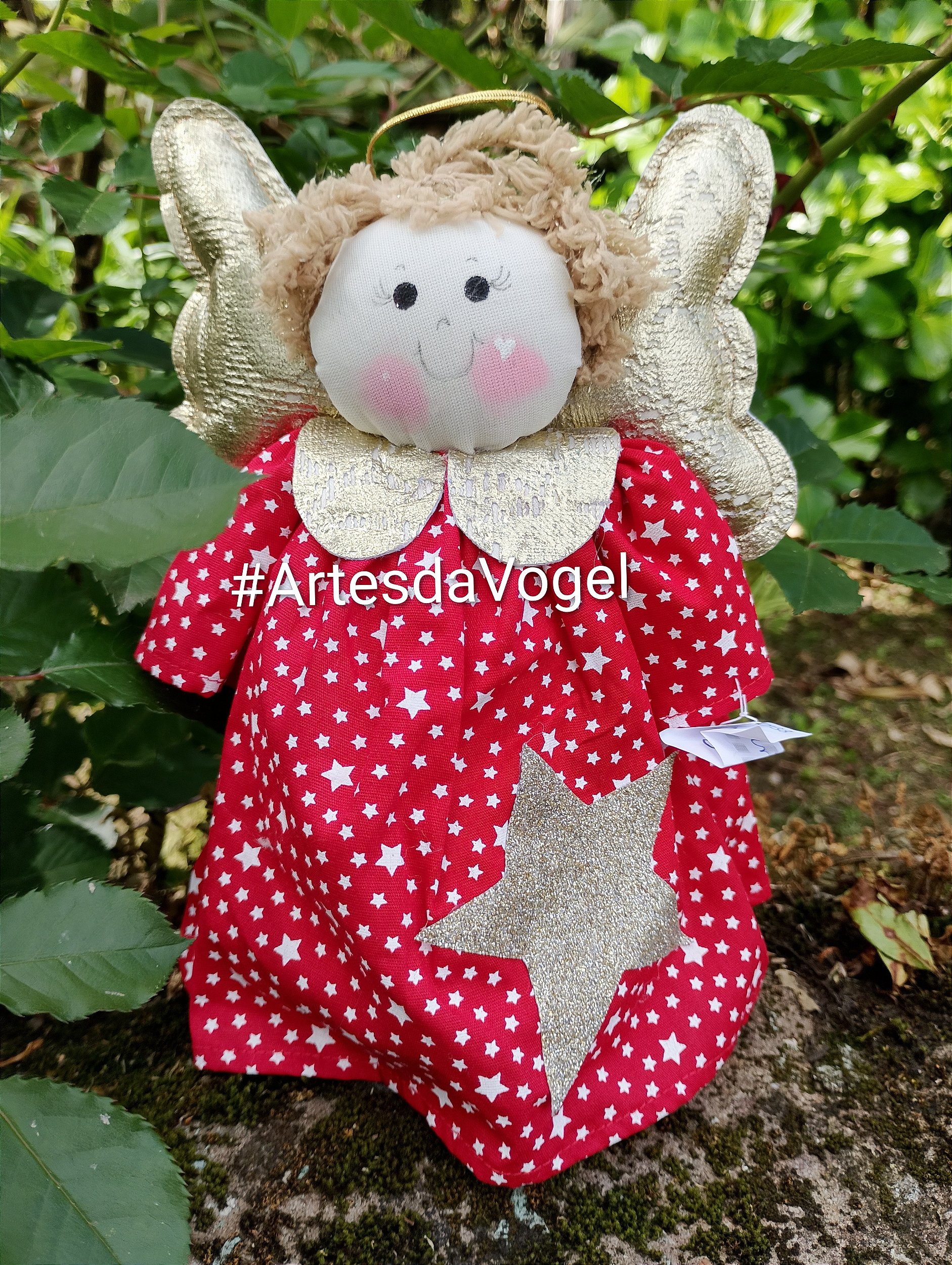 Artesanato feito com amor e dedicação. Anjinho decorativo em tecido de algodão estampado vermelho e sintético dourado, têm um leve peso na base para mantê-lo em pé, cabelos em lã e aureola dourada.