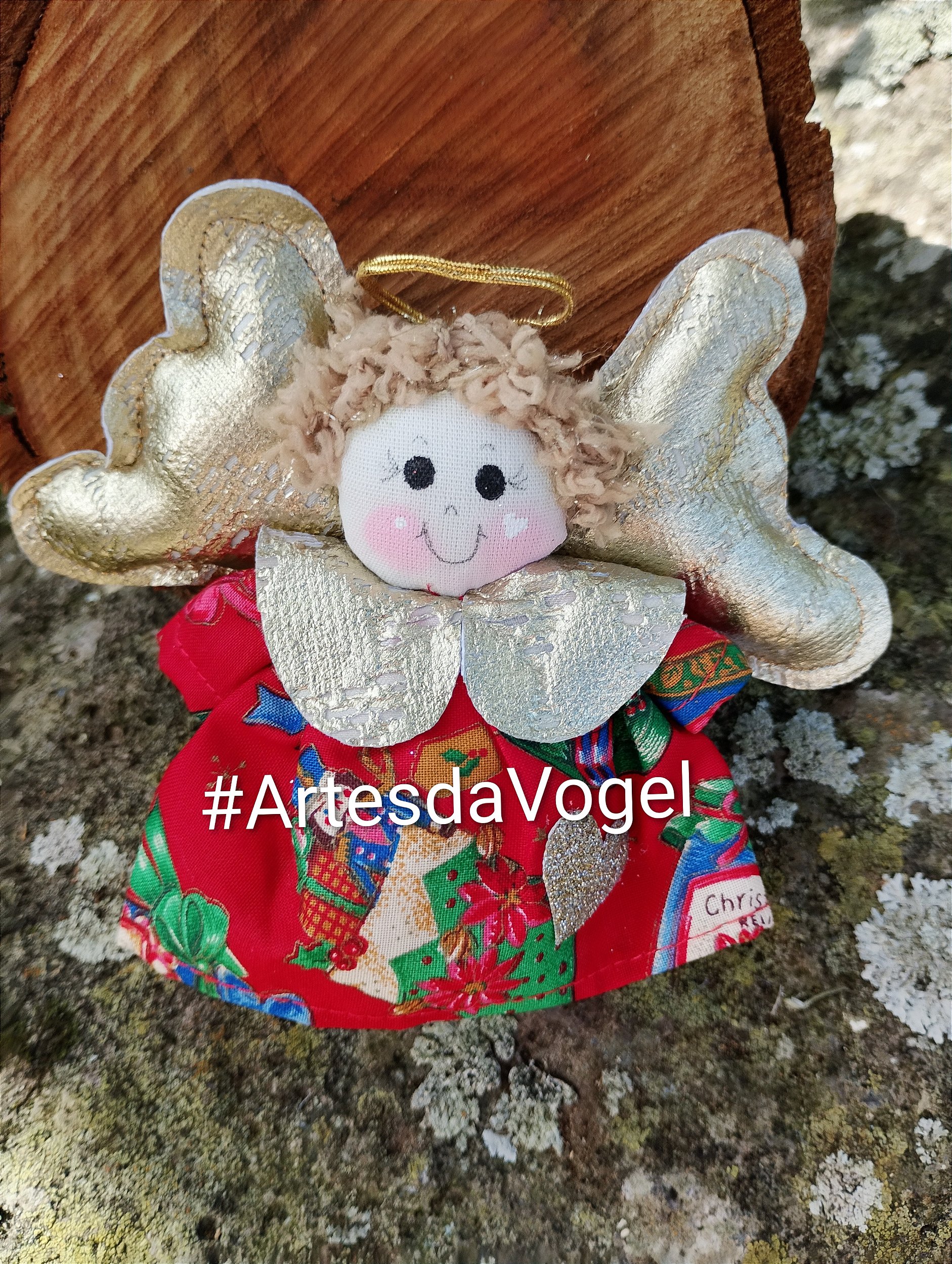 Artesanato feito com amor e dedicação. Anjinho decorativo em tecido de algodão estampado vermelho e sintético dourado, têm um leve peso na base para mantê-lo em pé, cabelos em lã e aureola dourada.
