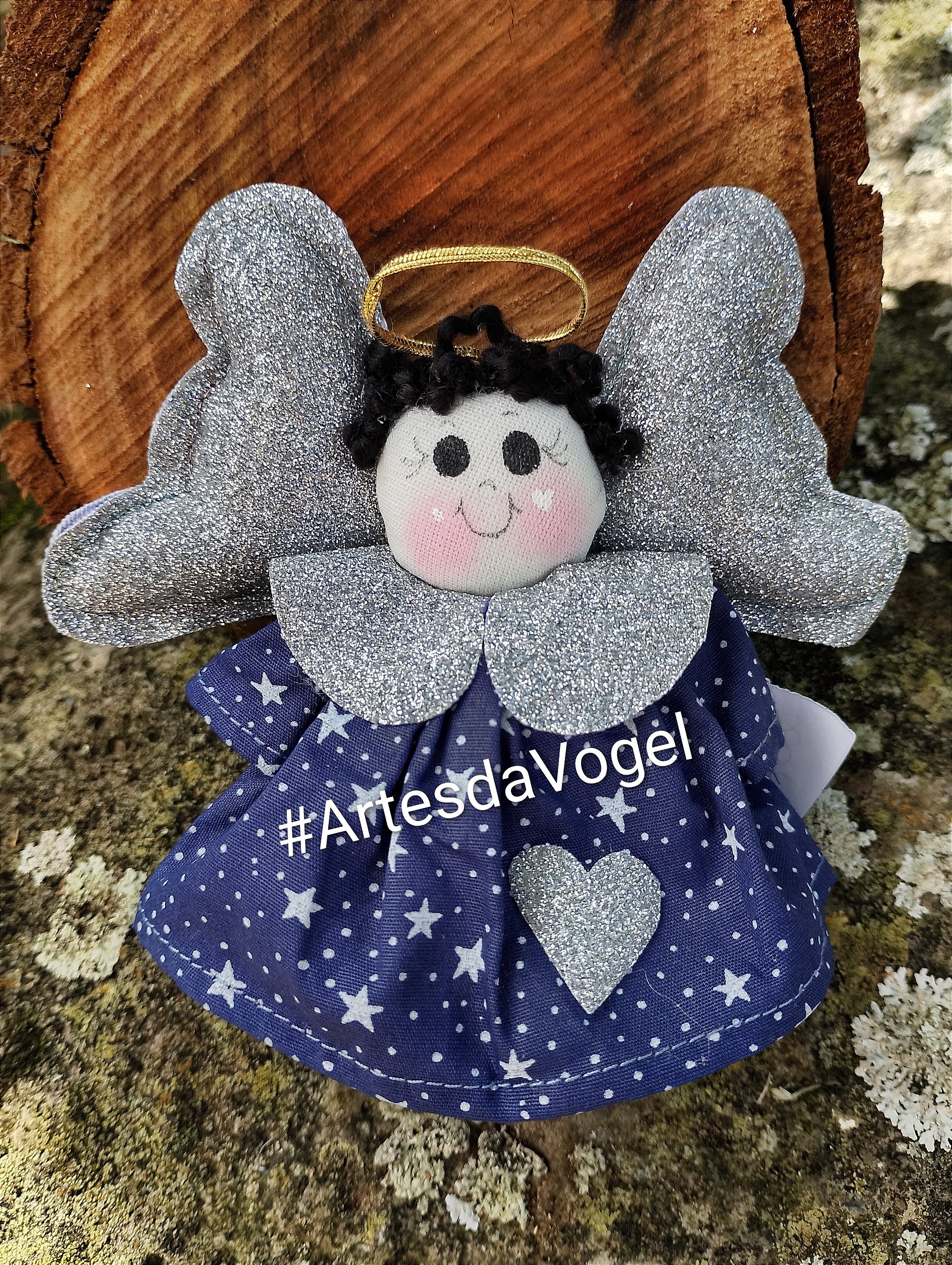 Artesanato feito com amor e dedicação. Anjinho decorativo em tecido de algodão estampado azul e sintético prata, têm um leve peso na base para mantê-lo em pé, cabelos em lã e aureola dourada.