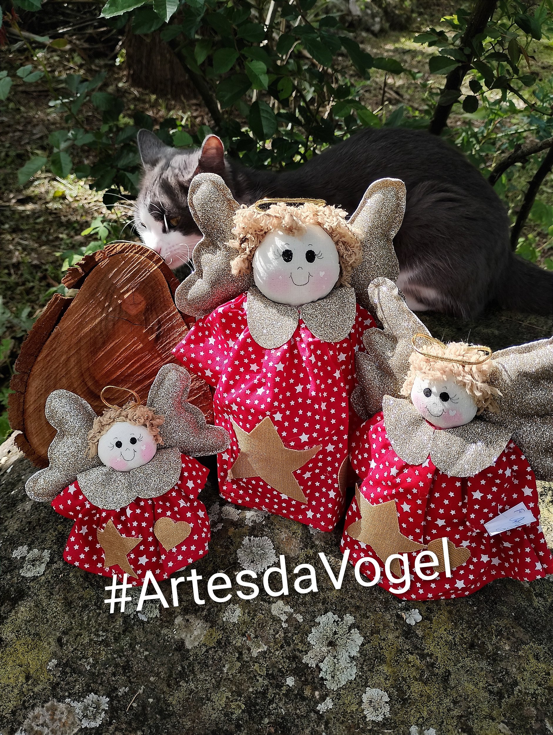 : Artesanato feito com amor e dedicação. Anjinho decorativo em tecido de algodão estampado vermelho e sintético dourado, têm um leve peso na base para mantê-los em pé, cabelos em lã e aureola dourada.