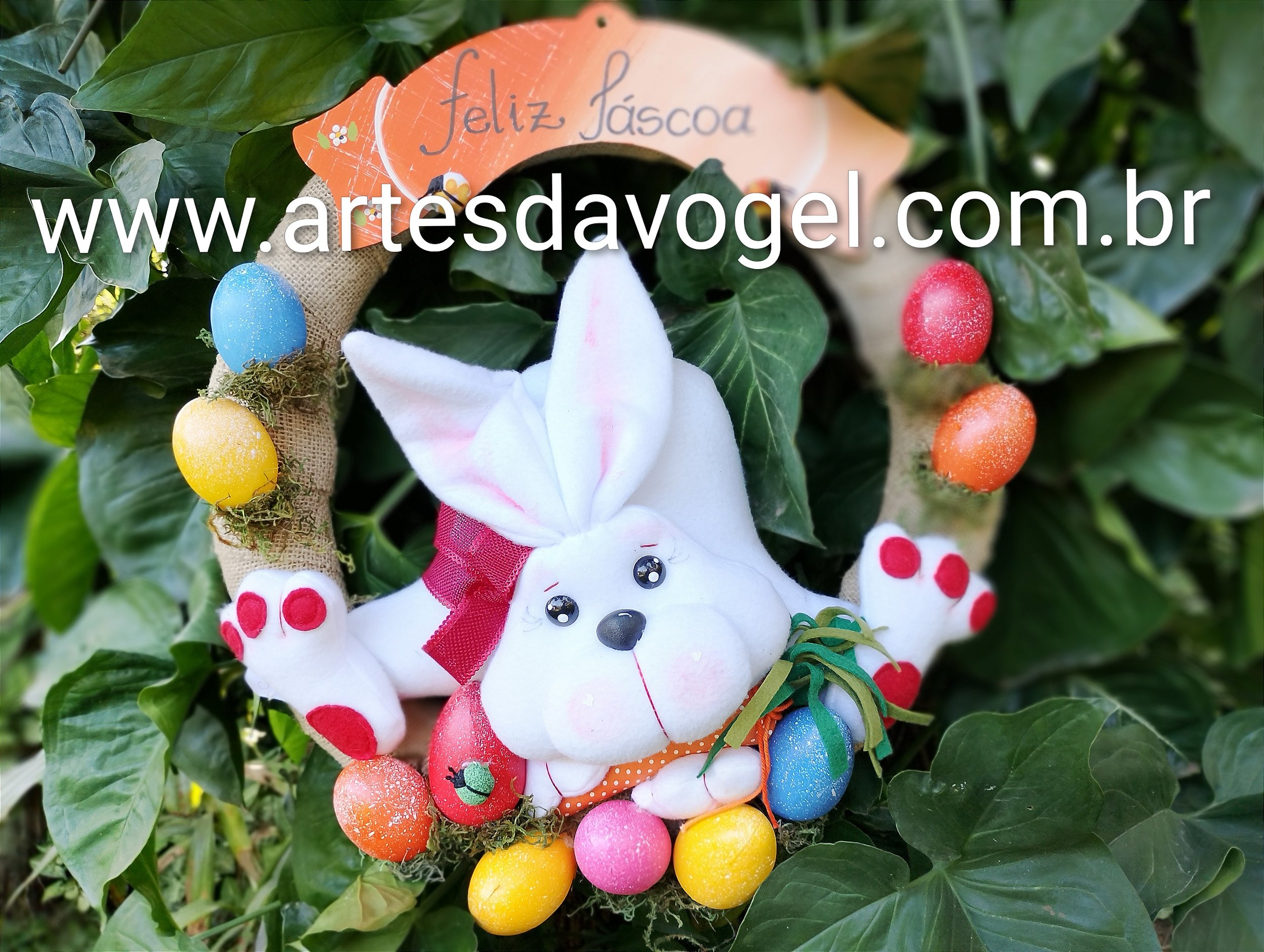 A guirlanda Coelha no Ninho é feita com amor e carinho. Têm uma linda coelha de plush no centro com os pezinhos desenhados, segurando uma cenoura e vários ovos coloridos em sua volta, como se estivesse sentada no ninho de Páscoa. Cada detalhe é pensado e feito com muito carinho e excelente acabamento. A guirlanda de palha é encapada com juta e têm um aro reforçado para suspender a guirlanda com segurança.