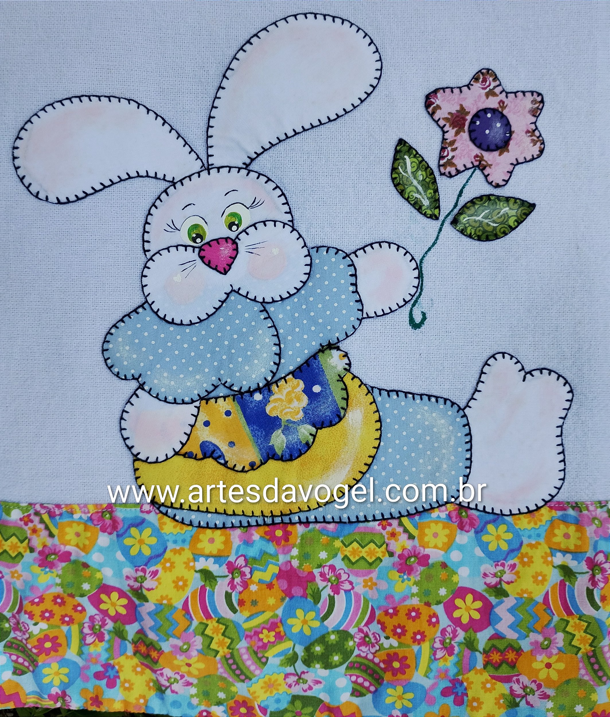 Pano de copa em pacht apliqué é uma técnica do pacthwork que trabalha com composição de cores em formatos diversos, aqui é uma linda coelhinha. Feito com amor e dedicação. Neste pano de copa ou pano de prato, foi utilizado o bordado pontpacth apliqué, cheio de detalhes e excelente acabamento. com um barrado em tecido estampado. Um capricho só , pra deixar o ambiente festivo e elegante pra Páscoa... criando memórias afetivas.
